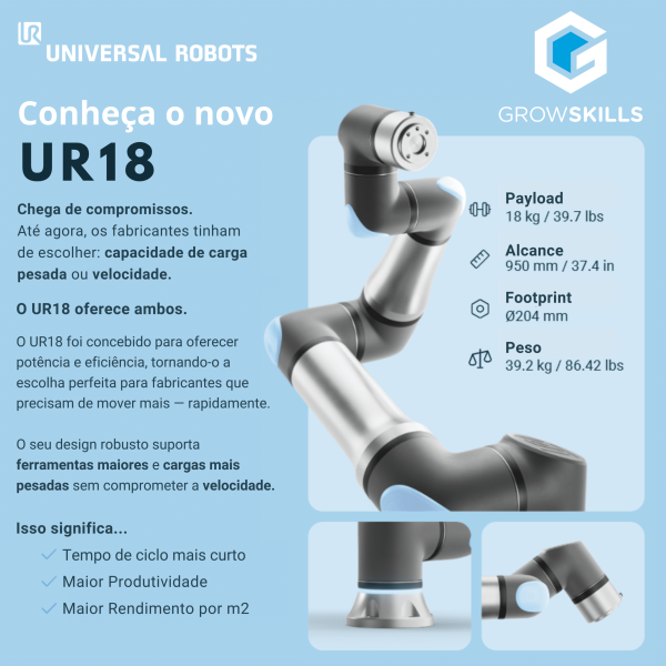 O UR18 combina força e agilidade, suportando efetores finais de maior dimensão capazes de levantar cargas úteis mais pesadas, sem deixar de ser suficientemente leve para permitir a montagem na maioria dos sistemas de pórtico convencionais. Com um alcance de 950 mm e velocidades até 4 m/s, é a solução ideal para aplicações de pick-and-place que exigem rapidez, onde a redução dos tempos de ciclo é determinante.