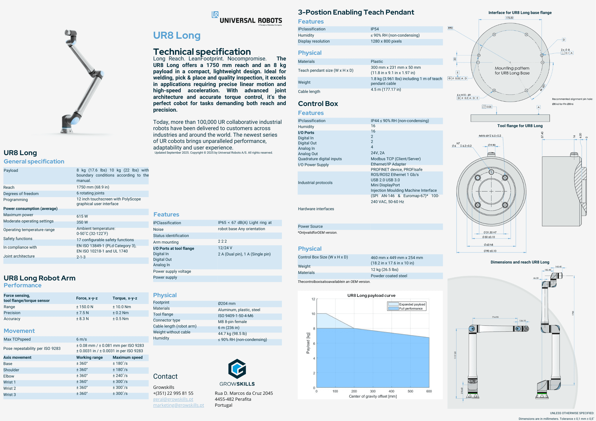 O Cobot UR8 Long combina longo alcance com máxima precisão num design compacto e leve. Com 1750 mm de alcance e capacidade de carga até 10 kg, é a escolha ideal para soldadura, pick & place e inspeção de qualidade.